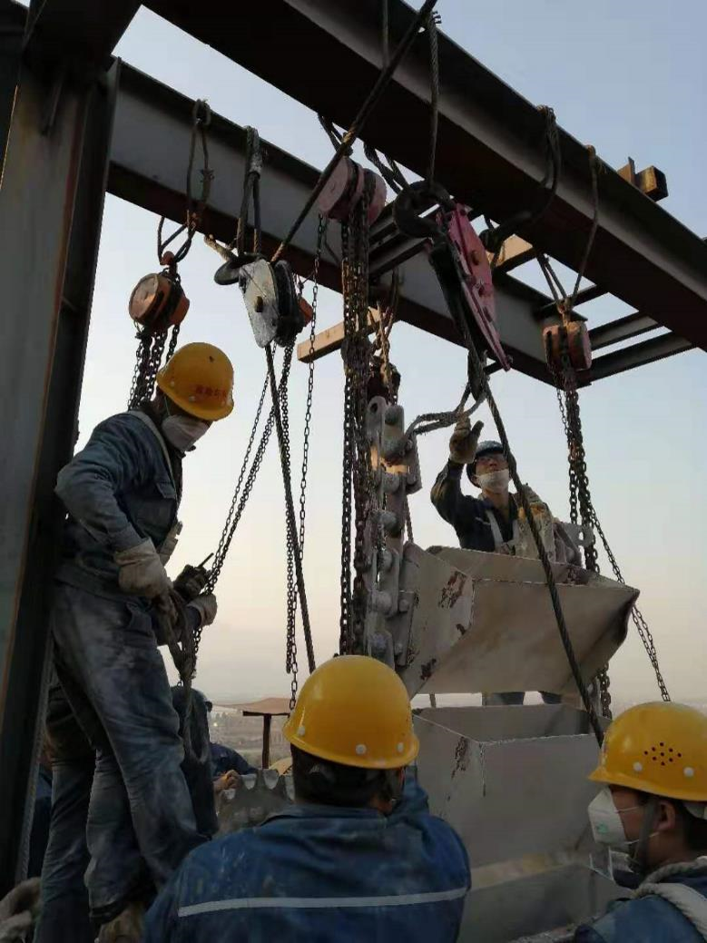 剛完成A2斗提鏈條的大修,A4鏈條又出現(xiàn)新問題。19日凌晨04:10分A4斗提鏈條突然斷裂,檢修班長王成東立刻帶領(lǐng)人員到現(xiàn)場處理設(shè)備故障,經(jīng)現(xiàn)場檢查發(fā)現(xiàn)50米高的斗提鏈條全部掉到斗提箱體的中部,需要將兩側(cè)斗提鏈條吊至50高的頭輪上,再進(jìn)行對接。如果采用兩臺250噸的吊車,將花費至少3萬元的費用,通過大家的討論,最終采用兩臺10噸卷揚機(jī)加4臺5噸的手拉葫蘆吊裝斗提鏈條,成功的將斗提鏈條吊至50米高的頭輪上。