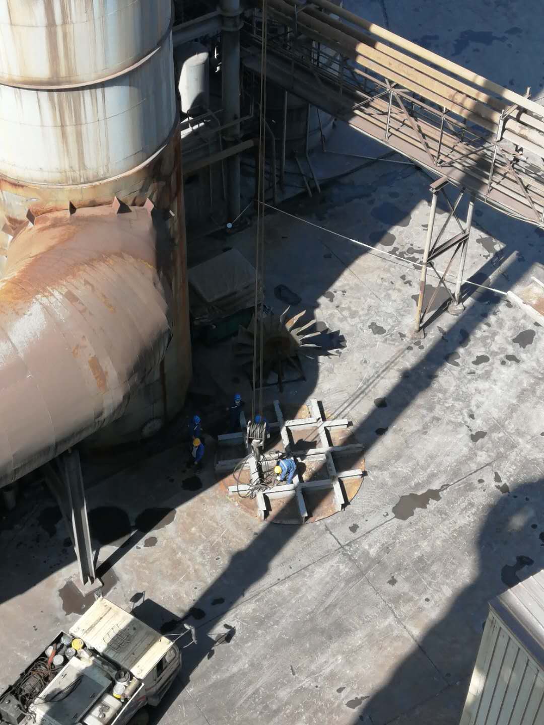 6月2日天氣晴朗,風(fēng)力1級(jí),具備良好的施工條件,7:30分130噸的吊車準(zhǔn)時(shí)到達(dá)拆除現(xiàn)場(chǎng),檢修班長(zhǎng)針對(duì)性的給班員講解具體的拆除工序,具體的安全措施、落實(shí)到個(gè)人、落實(shí)到互保對(duì)子。8:30分煙囪頂部的大蓋安全拆除,13:15分30噸重的第一節(jié)煙囪安全拆除,16:00分15噸重的第二節(jié)煙囪安全拆除。