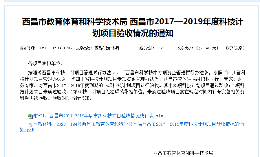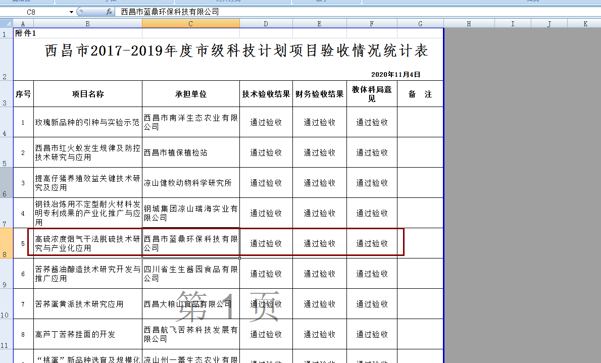 11月17日西昌市教育體育和科學(xué)技術(shù)局在西昌教育信息業(yè)務(wù)系統(tǒng)網(wǎng)公布了西昌市2017-2019年度科技計劃項目驗收情況,本次有23項科技計劃項目通過驗收,其中由西昌市藍(lán)鼎環(huán)?萍加邢薰境袚(dān)的市級科技計劃項目《高硫濃度煙氣干法脫硫技術(shù)研究與產(chǎn)業(yè)化應(yīng)用》在列。