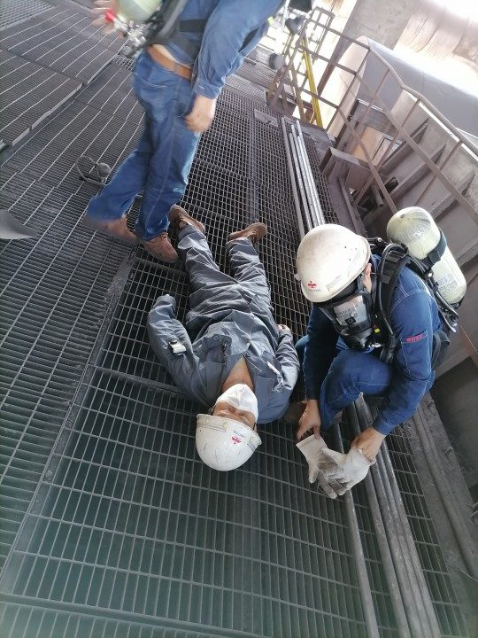 10:00演習(xí)正式開始,2號燒結(jié)機(jī)點火器平臺處巡檢員煤氣中毒倒地,另一名巡檢人員立即將中毒人員移動到上風(fēng)側(cè),用防爆對講機(jī)通知燒結(jié)中控室,中控室值班長收到到消息后,立即組織煤氣救護(hù)人員攜帶煤氣報警器,兩名救護(hù)人員正確迅速的穿戴好空氣呼吸器跑到2號燒結(jié)機(jī)點火器平臺,迅速的將煤氣中毒人員抬到通風(fēng)處,并且準(zhǔn)確的判斷中毒人員是否有呼吸和脈搏,發(fā)現(xiàn)中毒人員已無心跳無脈搏,立刻采用心肺復(fù)蘇實施搶救,經(jīng)過10分鐘的現(xiàn)場搶救中毒人員漸漸恢復(fù)了自主呼吸,中毒人員成功獲救。