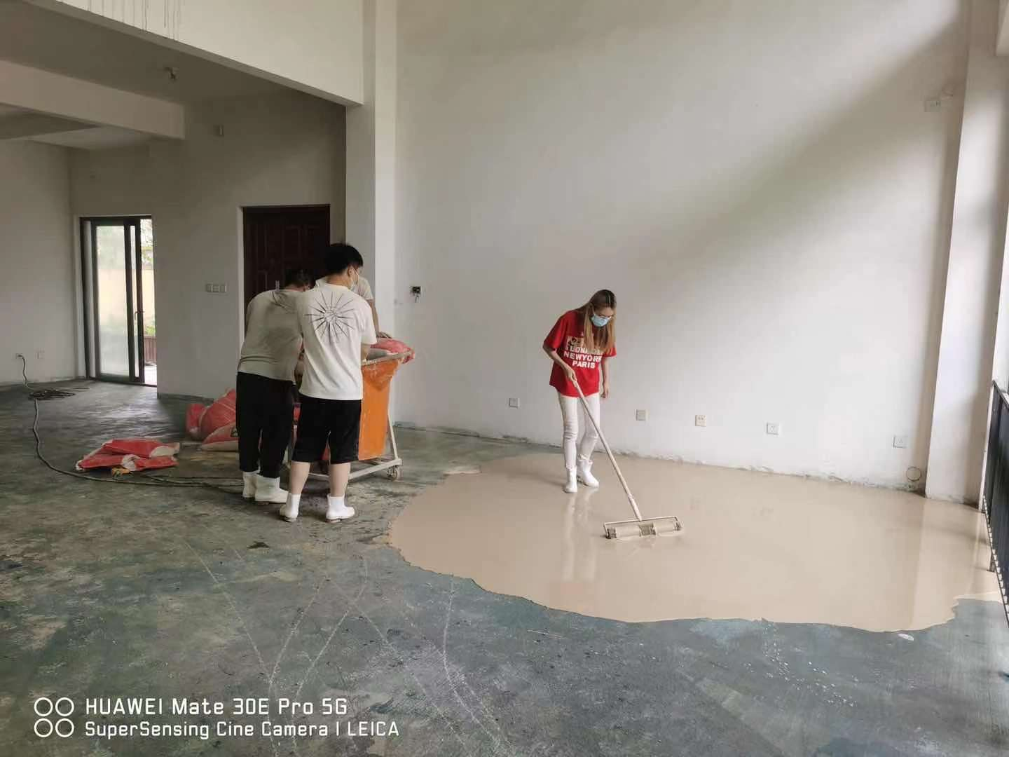 活動(dòng)開(kāi)始,建材事業(yè)部部長(zhǎng)李茂春組織將到場(chǎng)員工分成兩班組施工,各司其職,各班組有序施工。將一定比例的石膏基自流平與水混入攪拌桶內(nèi),持續(xù)攪拌約3分鐘,一次性倒在地面上,自流平的流動(dòng)性好,產(chǎn)品可以根據(jù)地面的高低不平順勢(shì)流動(dòng),對(duì)地面進(jìn)行自動(dòng)找平,無(wú)需外力推動(dòng)。2個(gè)班組耗時(shí)不到8小時(shí),完成450㎡施工作業(yè),等待24小時(shí)后,地面即干燥可使用。我司自產(chǎn)“藍(lán)花楹”自流平產(chǎn)品具有品質(zhì)好,施工便捷高效的特點(diǎn)。