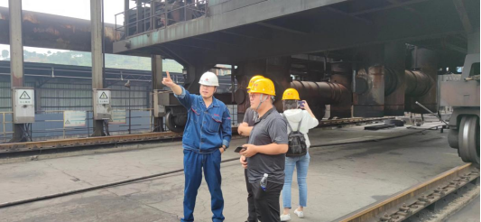第二組在生產(chǎn)部副部長(zhǎng)王建勇的帶領(lǐng)下來到了煉焦的生產(chǎn)現(xiàn)場(chǎng)推焦機(jī)旁,針對(duì)現(xiàn)場(chǎng)重主要設(shè)備的名稱及作用進(jìn)行行詳細(xì)了解。