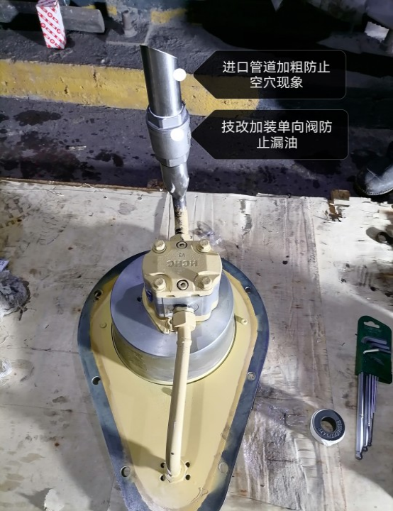 9月3日晚上8點(diǎn)天空下著大雨,2號燒結(jié)機(jī)正常槽滿停機(jī),2號脫硫脫硝系統(tǒng)同步停機(jī)檢修,由于疫情期間靜態(tài)管理,檢修班組上班人員只有11人,每天工作強(qiáng)度大,在人困馬乏的情況下,檢修班組冒著大雨開始拆除2期風(fēng)機(jī)液壓油泵,在拆解后發(fā)現(xiàn)油泵的進(jìn)油管偏小,并且無止回閥。檢修班組立即將進(jìn)油管切斷加裝了一個單向閥和將進(jìn)油管更換為大一型號的管子。當(dāng)日23:30分現(xiàn)場試驗油泵能正常將油抽出。檢修班將技改后的油泵停運(yùn)至9月5日11點(diǎn),再次啟動油泵,油泵運(yùn)行正常,技改成功。