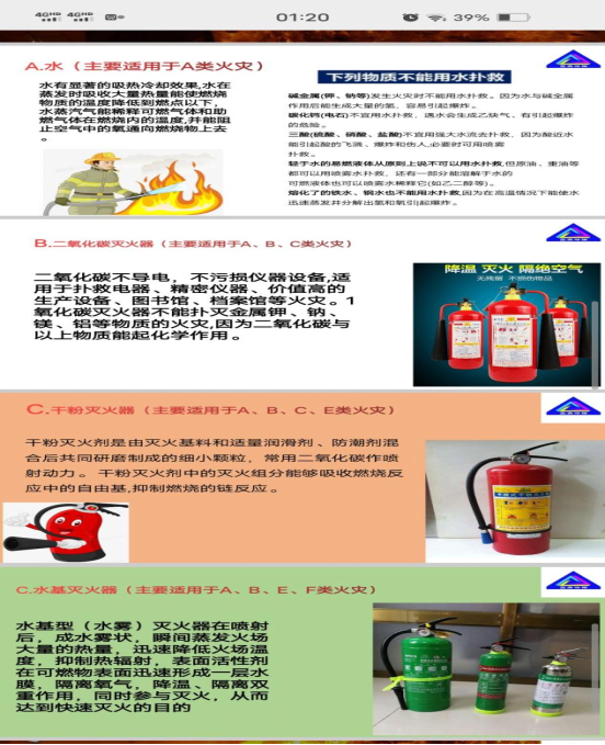 消防知識則從了解燃燒的基本條件,到滅火的幾種方法:冷卻法、隔離法、窒息法、抑制法,滅火器材的使用,放置地點,詳細(xì)的講述了應(yīng)對火災(zāi)的“四會”:會報警、會使用消防器材、會組織人員疏散逃生、會撲救初期火災(zāi)。四懂:懂本崗位的火災(zāi)危險性、懂預(yù)防火災(zāi)的措施、懂滅火方法、懂逃生方法。