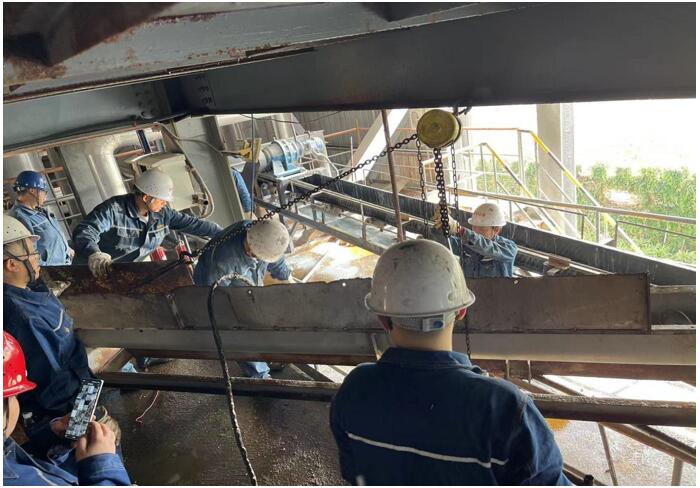 為更好解決后續(xù)物料輸送壓力,減少系統(tǒng)非計(jì)劃停機(jī),威遠(yuǎn)藍(lán)鼎生產(chǎn)部決定將兩條螺旋技改成輸送皮帶,10月30日,蒸發(fā)濃縮停機(jī)檢修,副總經(jīng)理黃安軍、副部長(zhǎng)楊平、宋雨鵬協(xié)同檢修班長(zhǎng)集中檢修骨干對(duì)氯化鈉螺旋進(jìn)行技改,31日13:30螺旋改輸送皮帶技改完成進(jìn)行試車,11月2日帶料試車正常,經(jīng)過(guò)一周使用觀察,本次技改相比螺旋故障率更低,物料輸送更松散、均勻,也大大改善了干燥前端下料堵塞等問(wèn)題,同時(shí)也得到了釩廠運(yùn)行車間的認(rèn)可和生產(chǎn)員工一致好評(píng),體現(xiàn)了公司敢于創(chuàng)新、技改的精神。