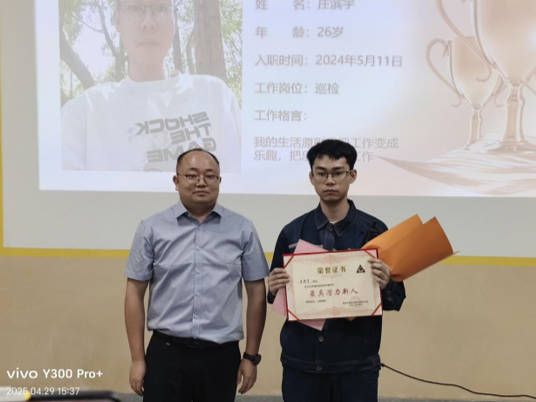 15:40,頒獎環(huán)節(jié)正式開始。首先頒發(fā)的是“最具潛力新人”獎項,由生產(chǎn)部副部長王建勇為莊濱宇頒獎。莊濱宇作為公司新生力量的代表,入職以來展現(xiàn)出極高的學習能力和工作熱情,迅速適應崗位需求,在工作中不斷突破自我,為公司發(fā)展注入了新的活力。莊濱宇在發(fā)言中表示將保持學習熱情,繼續(xù)努力,為公司創(chuàng)造更多價值。