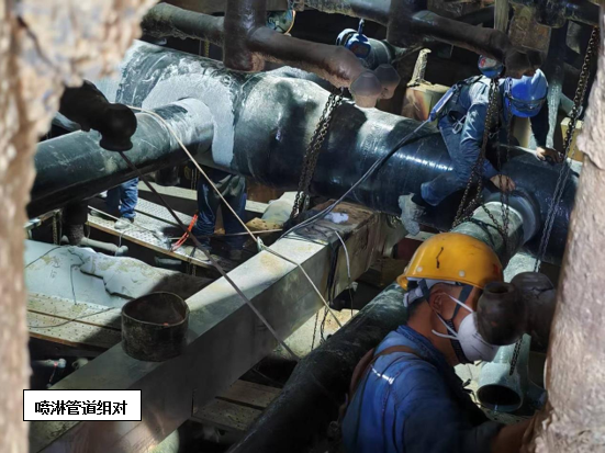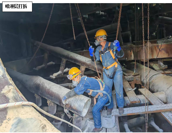 維修方案確定后,攀藍鼎立即開始著手噴淋管道采購預制工作,考慮到目前燒結(jié)產(chǎn)能不飽和,系統(tǒng)多處停機的因素,決定預制管道到廠后由檢修進行拆除及更換,只保留技術(shù)性要求較高的玻鋼粘接由專業(yè)施工人員來完成。7月24日,在材料到廠后,檢修立即開始在塔內(nèi)布置安全措施,并進行噴淋層打拆工作,打拆過程中檢修對切下的三通支管進行仔細甄別,磨損嚴重的進行報廢處理,還具備使用價值的作為備件歸置,以確保物盡其用。打拆完畢后,檢修隨即進行管道吊裝及內(nèi)部組裝配管工作,配管完成后防腐單位開始進場作業(yè),在此過程中檢修全程安排人員進行組對及工程質(zhì)量監(jiān)督工作,并及時撤場收尾。